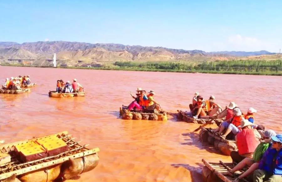游客在寧夏沙坡頭景區(qū)體驗(yàn)羊皮筏子
