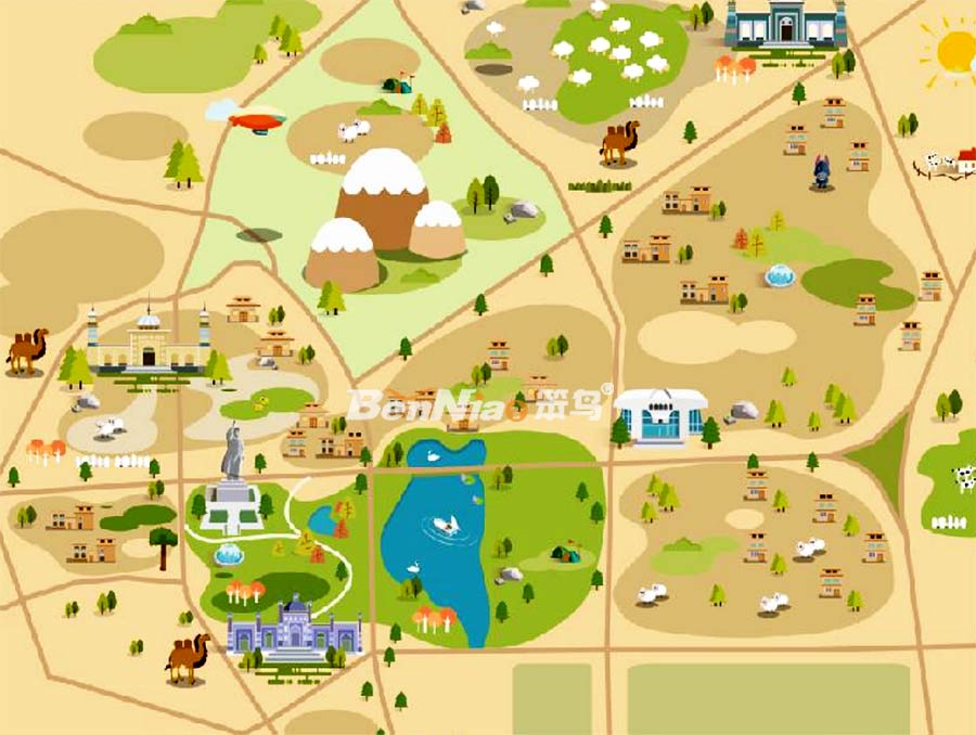 在景區(qū)全景圖設(shè)計上,選擇手繪地圖繪制風(fēng)格,簡潔、形象且?guī)в幸欢ㄈの缎缘陌研畔⒄宫F(xiàn)給游客。
