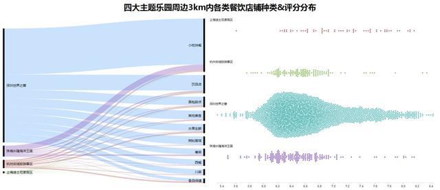 整體而言,各主題公園周邊的餐飲店鋪得分大多集中在5.5-8.5分之間,整體水平較好。