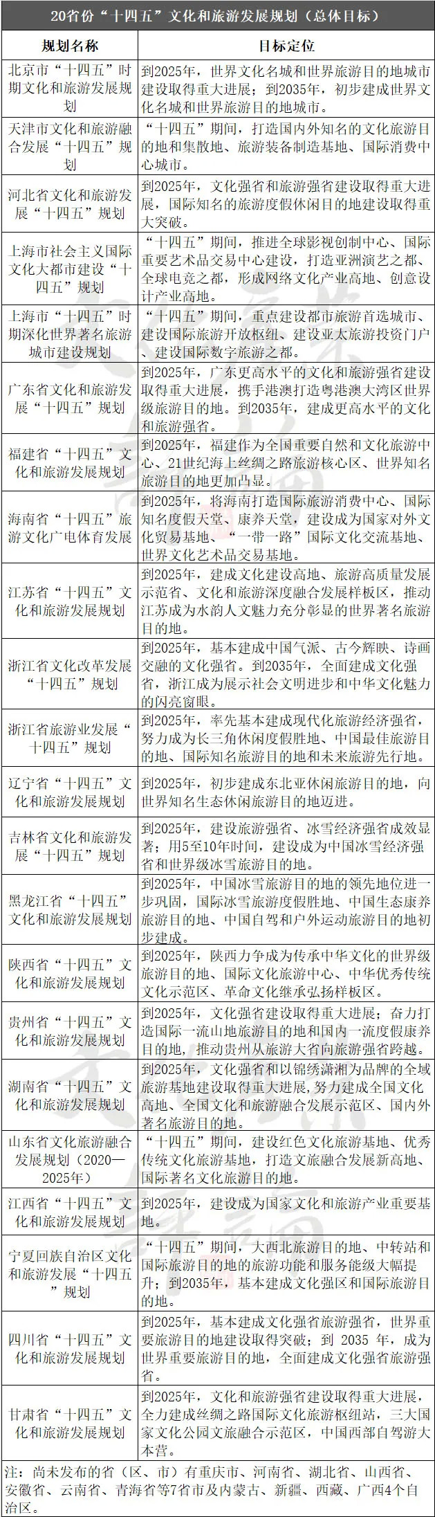 據(jù)不完全統(tǒng)計,截至2020年12月3日,已有包括北京、天津、上海、河北等在內(nèi)的20個省份發(fā)布了省級層面的“十四五”文化和旅游發(fā)展專項規(guī)劃(以下簡稱“文旅規(guī)劃”),對“十四五”時期文旅發(fā)展進行頂層設(shè)計和系統(tǒng)謀劃。