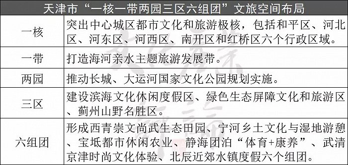 天津作為拱衛(wèi)首都的門戶城市、京津冀中世界級城市群之一,被定位為“全國先進制造研發(fā)基地、北方國際(8.090, 0.00, 0.00%)航運核心區(qū)、金融創(chuàng)新運營示范區(qū)、改革開放先行區(qū)”,在“十四五”《文旅規(guī)劃》中則提出,強化天津城市形象的國際化、多元化、生態(tài)化、智慧化,打造國內(nèi)外知名的文化旅游目的地和集散地、旅游裝備制造基地、國際消費中心城市。并提出“一核一帶兩園三區(qū)六組團”文旅融合空間布局。