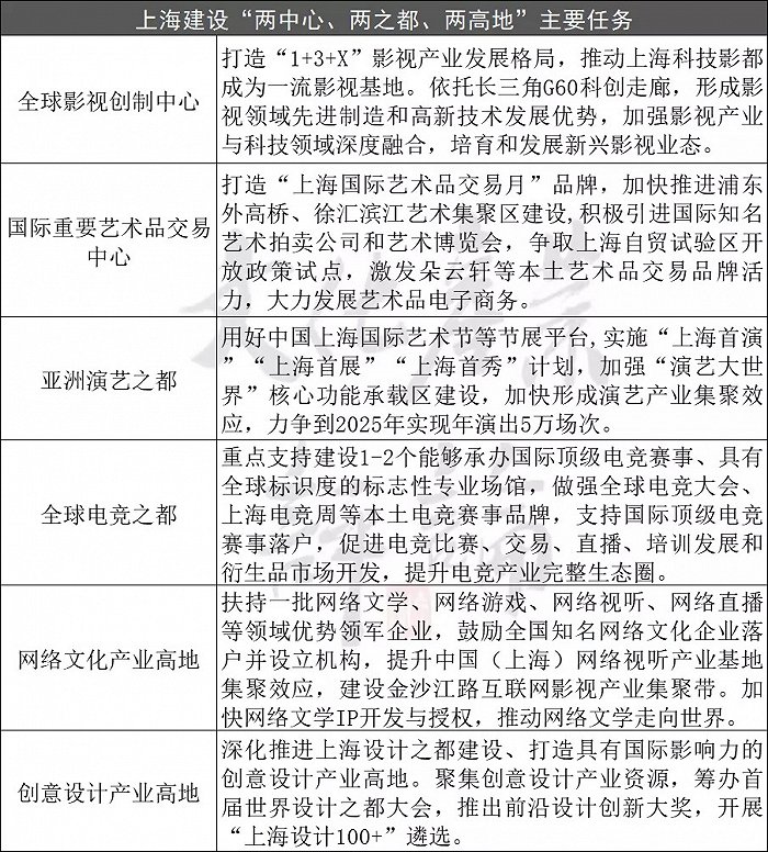 在《上海市社會主義國際文化大都市建設(shè)“十四五”規(guī)劃》中確立,到2025年,快建設(shè)成為更加開放包容、更富創(chuàng)新活力、更顯人文關(guān)懷、更具時代魅力、更有世界影響力的社會主義國際文化大都市”的總體目標(biāo)。并圍繞總體目標(biāo),重點聚焦“兩中心、兩之都、兩高地”,加快推進全球影視創(chuàng)制中心、國際重要藝術(shù)品交易中心、亞洲演藝之都、全球電競之都、網(wǎng)絡(luò)文化產(chǎn)業(yè)高地、創(chuàng)意設(shè)計產(chǎn)業(yè)高地建設(shè)。