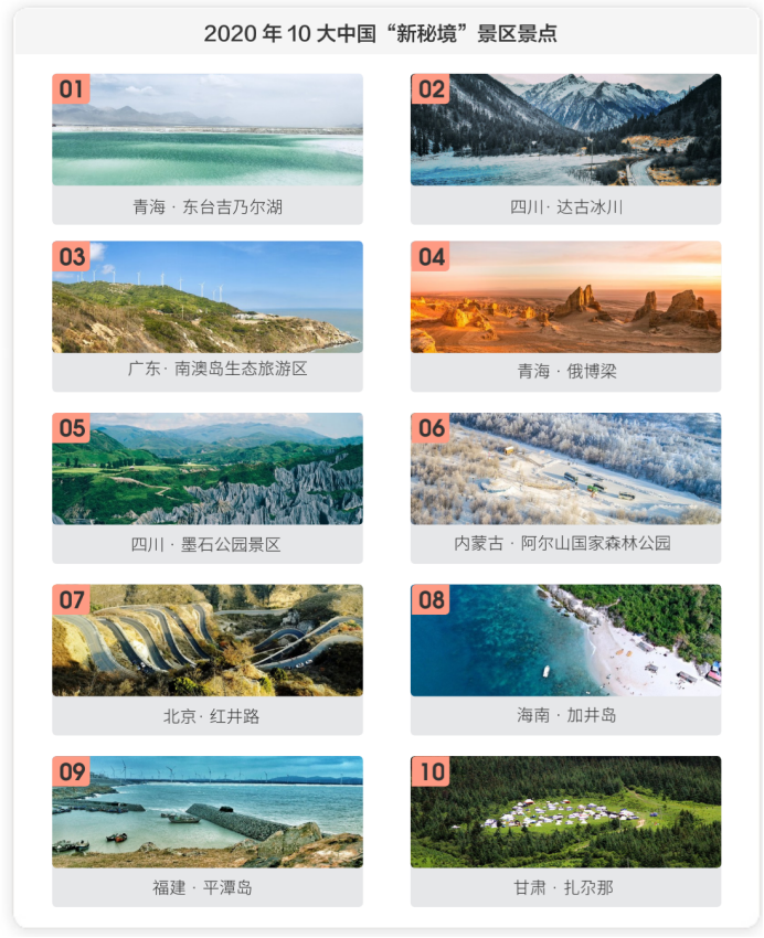 馬蜂窩旅游報(bào)告顯示,青海的東臺(tái)吉乃爾湖,四川的達(dá)古冰川,廣東汕頭的南澳島生態(tài)旅游區(qū)登陸2020年10大中國(guó)“新秘境”榜單前三甲。