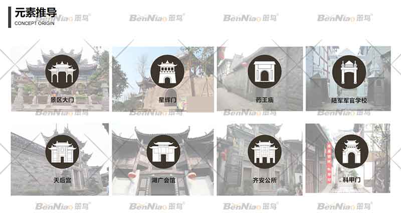 基于自然、歷史、文化、色彩等設計理念,我們對安居古鎮(zhèn)的核心特色進行分析,提取相關視覺元素,形成了自己設計思路。