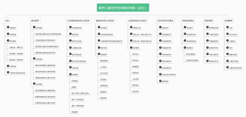 《城市兒童友好空間建設(shè)導(dǎo)則(試行)》總共分為九個(gè)章節(jié),整個(gè)文件從城市、街區(qū)、社區(qū)三個(gè)層面提出建設(shè)要點(diǎn),對公共服務(wù)設(shè)施、道路空間、公園綠地等兒童常出入空間提出適兒化改造,并對校外活動(dòng)場所和游憩設(shè)施建設(shè)提出要求,并且配合實(shí)施保障部分,努力推行兒童友好空間建設(shè)。