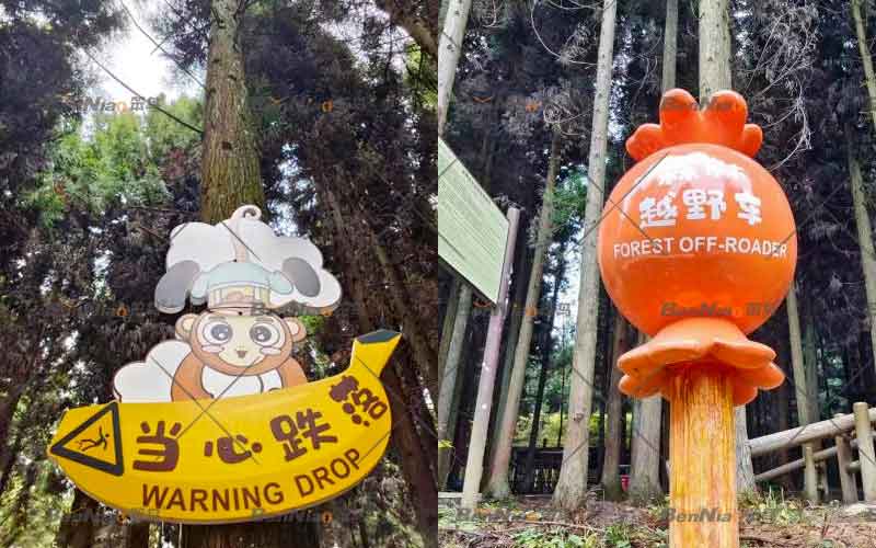 在警示標(biāo)識(shí)以及游樂項(xiàng)目名稱標(biāo)識(shí)上,笨鳥文旅也獨(dú)具創(chuàng)意,既貼合環(huán)境,又進(jìn)行了童趣的表達(dá),符合兒童的期待,也幫助兒童提高游憩體驗(yàn)。