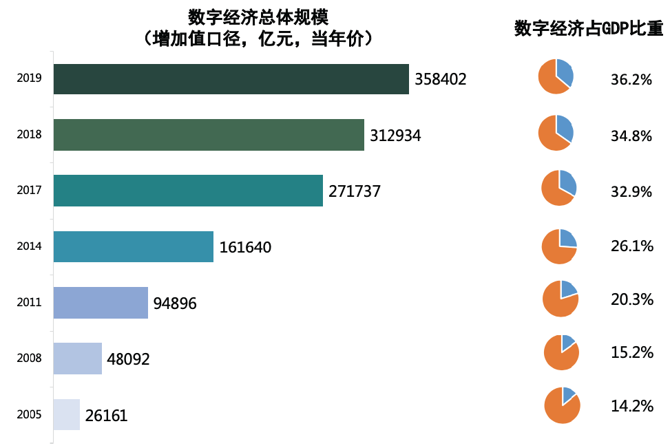 根據(jù)中國(guó)信息通信研究院發(fā)布的報(bào)告顯示,2018年全球47個(gè)主要國(guó)家數(shù)字經(jīng)濟(jì)總規(guī)模超30.2萬(wàn)億美元,占GDP比重高達(dá)40.3%;我國(guó)數(shù)字經(jīng)濟(jì)增加值規(guī)模則由2005年的2.6萬(wàn)億元擴(kuò)張到2019年的35.8萬(wàn)億元,數(shù)字經(jīng)濟(jì)占GDP比重逐年提升,在國(guó)民經(jīng)濟(jì)中的地位進(jìn)一步凸顯。2005年至2019年我國(guó)數(shù)字經(jīng)濟(jì)占GDP比重由14.2%提升至36.2%,2019年占比同比提升1.4個(gè)百分點(diǎn)。