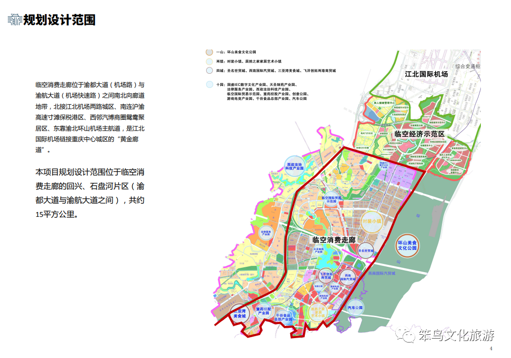 《重慶市渝北區(qū)國民經(jīng)濟和社會發(fā)展第十四個五年規(guī)劃和二〇三五年遠景目標綱要》 渝北十四五規(guī)劃提出全力推動臨空都市區(qū)建設(shè),臨空產(chǎn)業(yè)占地區(qū)生產(chǎn)總值的比重提高到50%:圍繞“機場城市、公園城市、智慧城市”一體建設(shè),高標準建設(shè)國 際化、綠色化、智能化、人文化的國際臨空大都市。打造千億級現(xiàn)代消費走廊。以“兩鎮(zhèn)三街三城十園”為載體,高標準規(guī)劃建設(shè)機場商務(wù)區(qū),加快時裝小鎮(zhèn)、三亞灣海鮮美食城、西南 國際汽貿(mào)城、居然之家智能家居小鎮(zhèn)等重點平臺建設(shè)。提升消費能 級水平,培育和打造一批有名氣、有新意,具有資源稀缺性和地方 文化特色的“園中園”。積極支持和指導(dǎo)各類消費平臺申報A級旅游 景區(qū)、市級特色街(夜市)、中華美食街等,提升品牌效應(yīng)。打造 會品牌,支持龍頭企業(yè)打造一批有影響力的博覽會、購物節(jié)、時 尚周、消費展等市場化、國際化服務(wù)消費新平臺,以節(jié)會帶動消費。激發(fā)市場主體活力,加快引入社會資源,鼓勵采取整租、聯(lián)租和入 股、合作等方式,引進有品牌有資源的第三方運營機構(gòu)推動平臺載 體轉(zhuǎn)型升級。力爭到2025年,消費收入超過1000億元,全面建成千億級現(xiàn)代消費走廊?!吨貞c市培育建設(shè)國際消費中心城市實施方案》 推進公共場所國際化引導(dǎo)標識 拓展“消費+”國際消費體驗新場景。本次任務(wù)要遵循綠色生態(tài)原則、充滿關(guān)愛的通用設(shè)計原則、形式的變化原則、視覺流向的立體化原則、色彩的親和協(xié)調(diào)原則,完成概念性設(shè)計和規(guī)劃設(shè)計。包含:1.重要出入干道形象標識、重點產(chǎn)業(yè)精神堡壘標識;2.區(qū)塊指引標識、地標定位標識;3.人行指引標識、車行輔助標識、總導(dǎo)覽圖、人行簡易信息指引(如風(fēng)向標,上墻指引等);4.行政辦公場所指向標識、衛(wèi)生間指引標識、停車場指引標識、地標建筑或公共空間信息展示標識;5.安全警示標識、溫馨提示類標識。以及所有項目標識導(dǎo)視規(guī)劃布點設(shè)計、部分專屬字體及圖標系統(tǒng)設(shè)計、本區(qū)域地圖系統(tǒng)導(dǎo)覽系統(tǒng)設(shè)計、地標介紹或文化科普等插畫設(shè)計等。