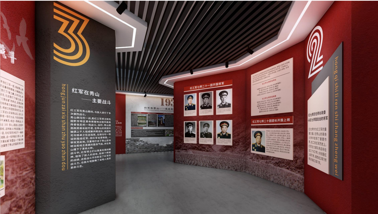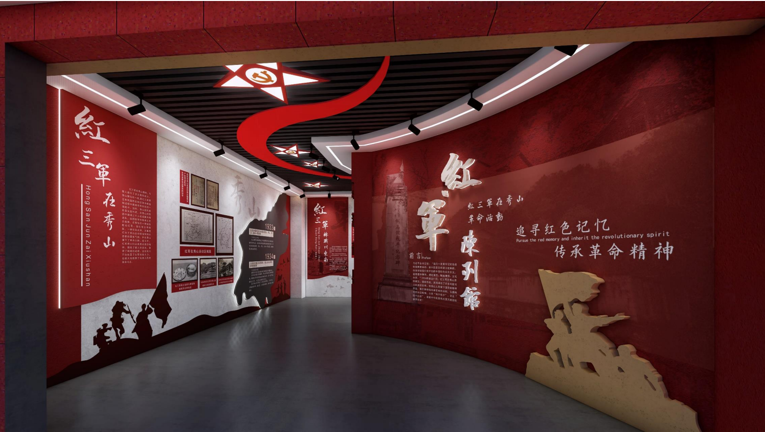 區(qū)別于城市展館的繁復(fù)華麗,本設(shè)計追求極簡主義的美學(xué)理念,以簡潔的線條和沉穩(wěn)的色彩搭配,營造出一種靜謐而莊嚴(yán)的氛圍。這種設(shè)計風(fēng)格不僅符合紅色文化的莊重性,也讓游客在參觀過程中能夠更加專注于歷史信息的接收與思考,實現(xiàn)心靈的洗禮與升華。