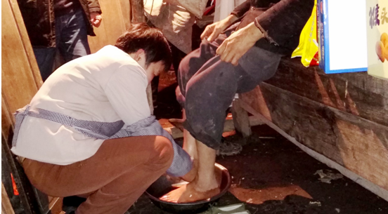 當(dāng)徐玉梅經(jīng)理把慰問金交到老人手中的時(shí)候,在昏黃的燈光下,大家才看清楚在這個(gè)大冷天老人還赤著腳,腳上的沾滿了泥土。徐經(jīng)理趕緊扶老人在床邊坐下,一同隨行的秩序維護(hù)部班長(zhǎng)楊德純,他把暖水瓶里的熱水倒進(jìn)盆里,和身邊的保潔阿姨為老人洗起腳來。不會(huì)說話的老人那時(shí)眼睛里開始泛起了淚光,臉色也漸漸紅潤(rùn)起來,露出了微笑。他不會(huì)說話,只用慈祥的目光看著這一群和自己沒有一點(diǎn)血緣關(guān)系的金輝物業(yè)人。