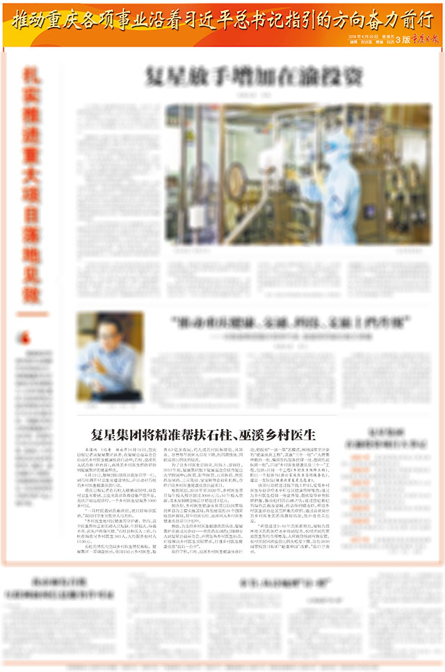 4 月19 日,重慶日報記者從復星集團獲悉,在復星公益基金會啟動的鄉(xiāng)村醫(yī)生健康扶貧行動中,石柱、巫溪列入試點縣(自治縣),兩地的鄉(xiāng)村醫(yī)生群體將得到復星集團的健康幫扶。