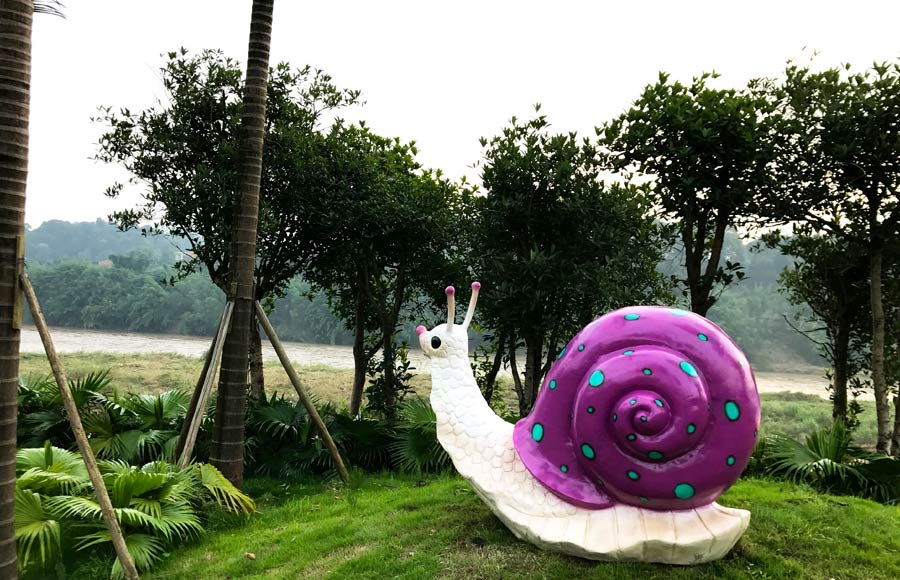 小品以蝸牛造型為載體,蝸牛雖然沒(méi)有矯健的身姿,但其不懈努力、執(zhí)著爬行的精神讓人敬佩,用黃、紫、橙展現(xiàn)出蝸牛的活潑可愛(ài),整個(gè)雕塑充滿歡樂(lè)。立體化地展現(xiàn)了赤水河旅游景區(qū)生命脈絡(luò),充滿正能量。