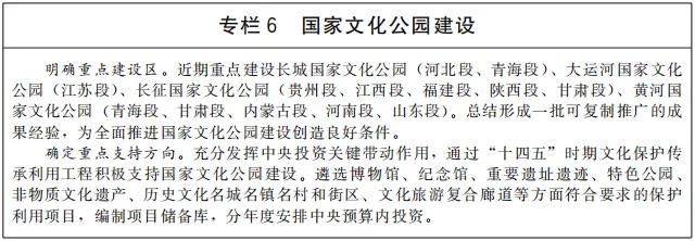 推進(jìn)國(guó)家文化公園建設(shè),生動(dòng)呈現(xiàn)中華文化的獨(dú)特創(chuàng)造、價(jià)值理念和鮮明特色,樹立和突出各民族共享的中華文化符號(hào)和中華民族形象,探索新時(shí)代文物和文化資源保護(hù)傳承利用新路徑,把國(guó)家文化公園建設(shè)成為傳承中華文明的歷史文化走廊、中華民族共同精神家園、提升人民生活品質(zhì)的文化和旅游體驗(yàn)空間。加快建設(shè)長(zhǎng)城、大運(yùn)河、長(zhǎng)征、黃河等國(guó)家文化公園,整合具有突出意義、重要影響、重大主題的文物和文化資源,重點(diǎn)建設(shè)管控保護(hù)、主題展示、文旅融合、傳統(tǒng)利用四類主體功能區(qū),實(shí)施保護(hù)傳承、研究發(fā)掘、環(huán)境配套、文旅融合、數(shù)字再現(xiàn)五大工程,突出“萬里長(zhǎng)城”、“千年運(yùn)河”、“兩萬五千里長(zhǎng)征”、“九曲黃河”整體辨識(shí)度。推進(jìn)優(yōu)質(zhì)文化旅游資源一體化開發(fā),科學(xué)規(guī)劃、開發(fā)文化旅游產(chǎn)品和商品。推出參觀游覽聯(lián)程聯(lián)運(yùn)經(jīng)典線路,開展整體品牌塑造和營(yíng)銷推介。