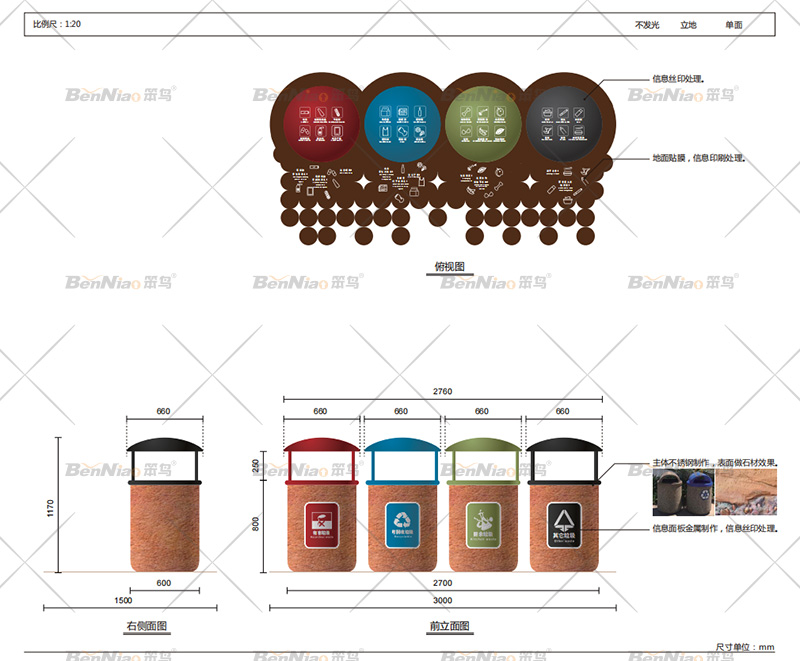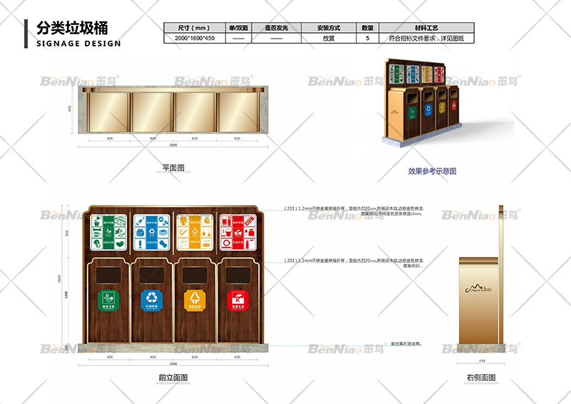 此垃圾桶的設(shè)計根據(jù)景區(qū)特色提取要素,在桶身設(shè)計上左右倆側(cè)設(shè)計可回收與其他垃圾的收納箱。材質(zhì)選用木材鋼板,整體結(jié)構(gòu)合理,滿足各種功能需求,又突出主題,造型既實用又很簡潔大氣。
