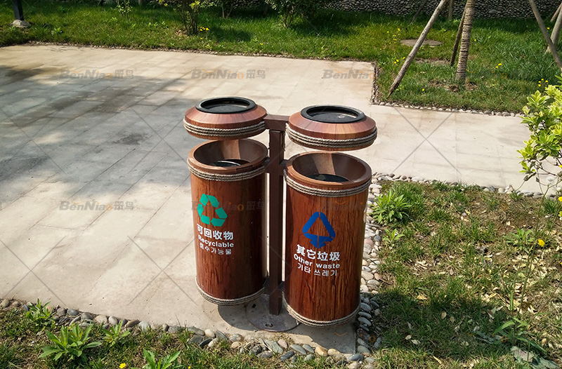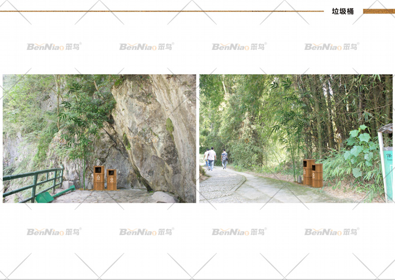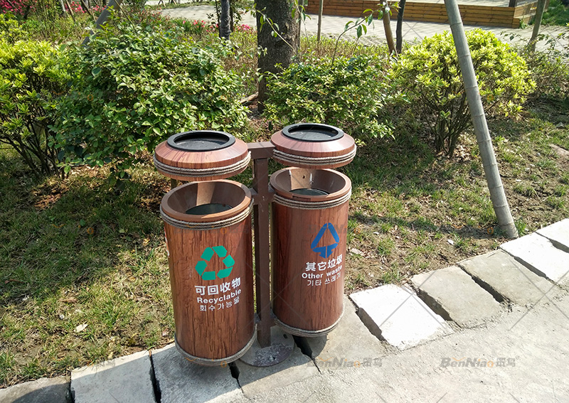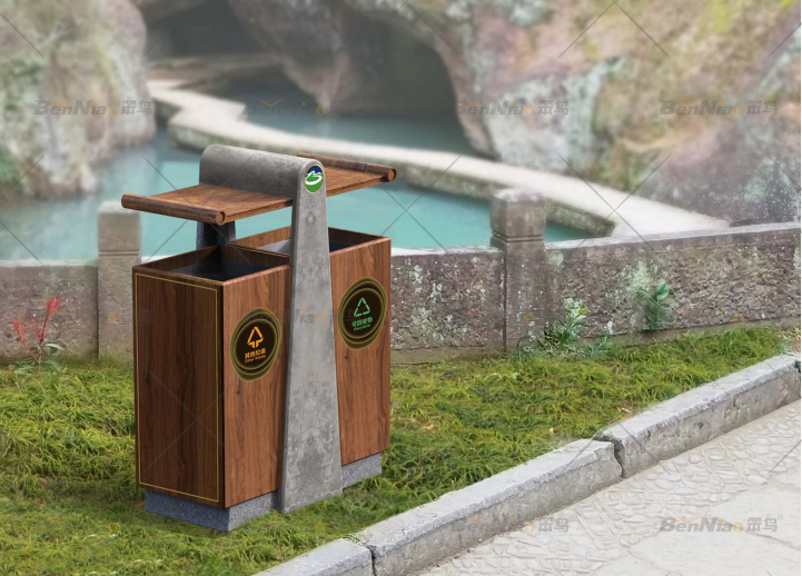 垃圾桶的設(shè)計應(yīng)體現(xiàn)環(huán)保理念,設(shè)置分類回收垃圾桶,在材料選擇上內(nèi)桶可以選擇塑料、金屬,方便實用,外桶則應(yīng)根據(jù)景區(qū)主題選擇木材、石材、不銹鋼、竹子等材料。