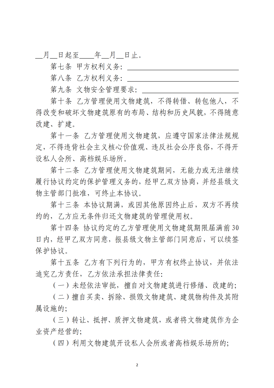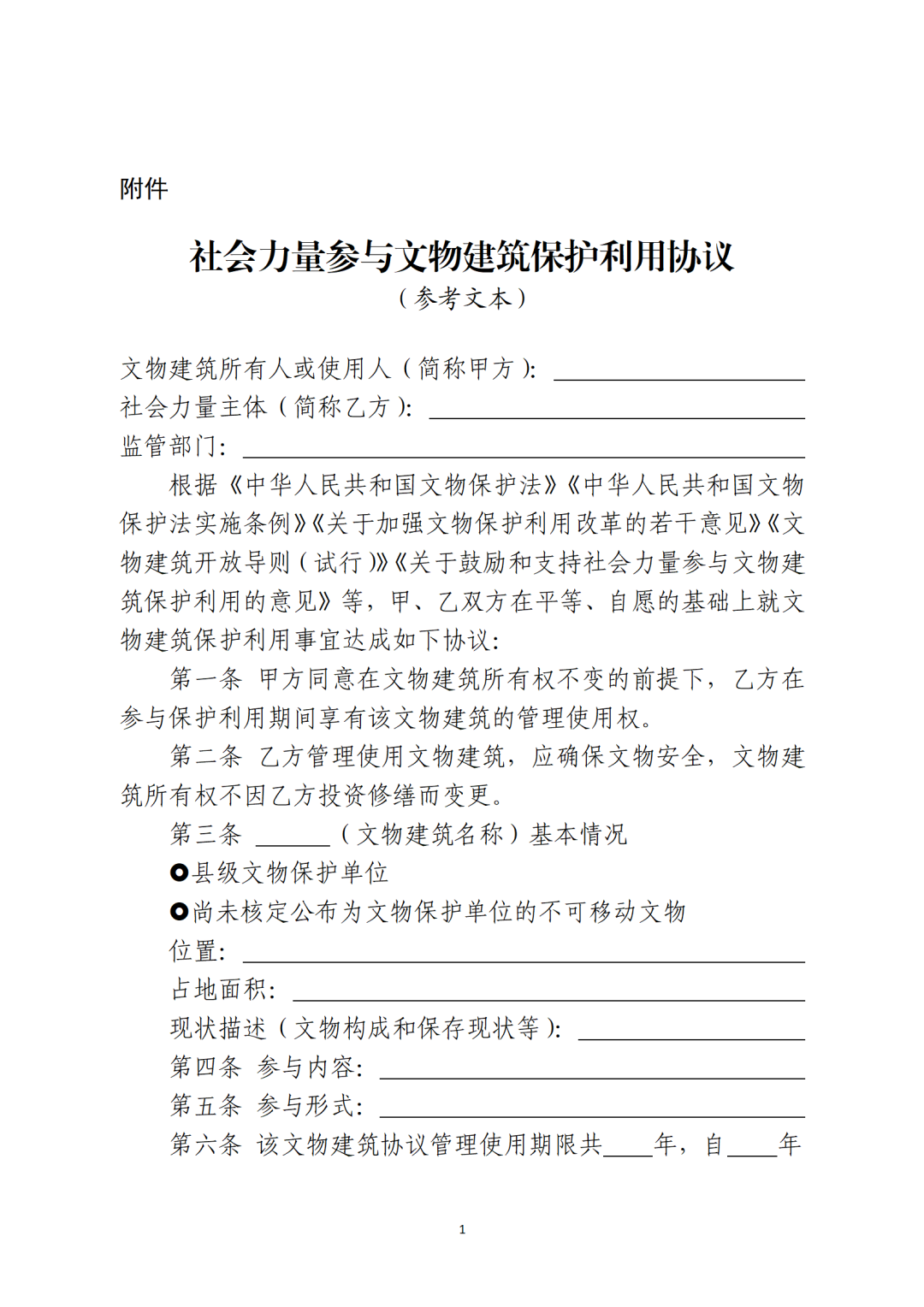 省級(jí)文物主管部門可參照社會(huì)力量參與文物建筑保護(hù)利用協(xié)議參考文本(附后),結(jié)合本地實(shí)際,制定社會(huì)力量參與文物建筑保護(hù)利用協(xié)議文本。按照“一處一策”原則,文物建筑所有人或使用人與確定的社會(huì)力量主體簽訂保護(hù)利用協(xié)議,明確保護(hù)利用要求、各方權(quán)利義務(wù)和違約責(zé)任等內(nèi)容。沒有明確使用人的國有文物建筑可由縣級(jí)文物主管部門與社會(huì)力量主體簽訂保護(hù)利用協(xié)議。協(xié)議簽訂后,應(yīng)報(bào)至省級(jí)文物主管部門備案。