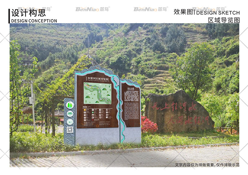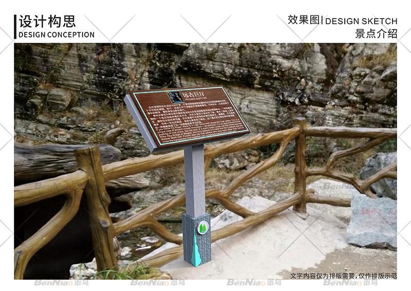 三、說明導(dǎo)視系統(tǒng):在旅游景區(qū)中說明性導(dǎo)視系統(tǒng)必不可少。它表達了希望被游客了解的內(nèi)容,讓游客對當?shù)氐木皡^(qū)特色、歷史、旅游景點等有一定的了解。讓游客在旅行的過程中擁有更好的體驗。同時也方便管理者進行管理。笨鳥文旅為水銀河大峽谷景區(qū)規(guī)劃設(shè)計的景區(qū)介紹標識牌。