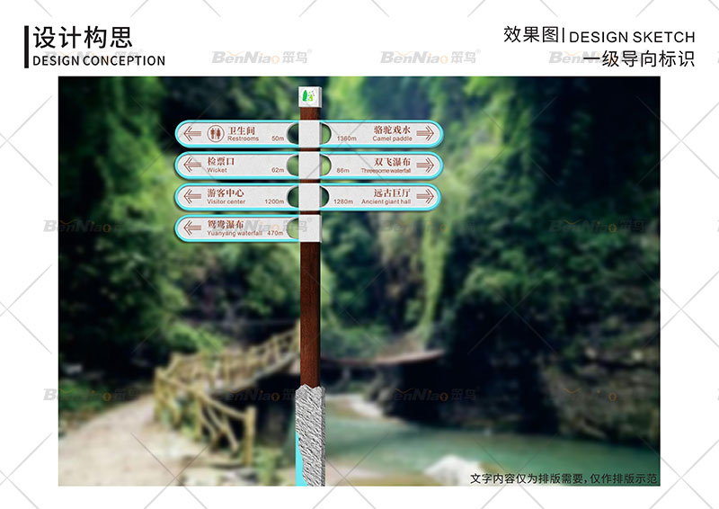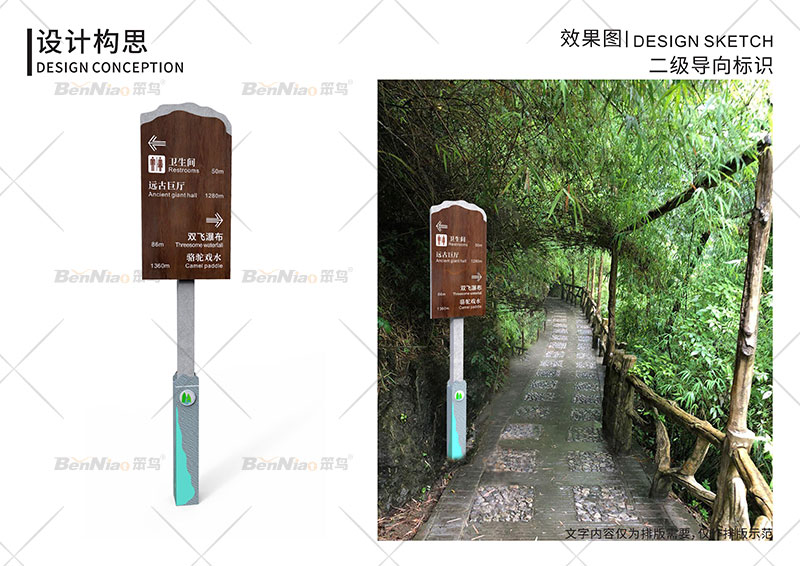 在當前的社會環(huán)境當中,國家對第三產(chǎn)業(yè)高度重視,同時第三產(chǎn)業(yè)已經(jīng)成為了國民經(jīng)濟的一個重要部門,相關(guān)的管理部門和管理人員對旅游景區(qū)的標識系統(tǒng)給予高度的重視。景區(qū)標識系統(tǒng)作為風景區(qū)重要的旅游服務(wù)設(shè)施,要在協(xié)調(diào)好“經(jīng)濟一社會一生態(tài)”三大效益的基礎(chǔ)上進行規(guī)劃和管理,用綠色環(huán)保設(shè)計理念進行設(shè)計和制作。努力實現(xiàn)景區(qū)標識系統(tǒng)功能的合理化、實用的舒適化、空間藝術(shù)的人性化。一套完整的、人性化的、有特色的、審美的導(dǎo)視系統(tǒng)一方面能夠為游客帶來美好的旅游體驗,另一方面也能從本質(zhì)上提升景區(qū)的形象。