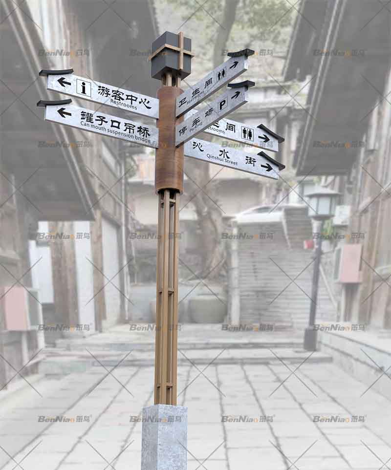 隨著文旅特色小鎮(zhèn)的加速發(fā)展建設(shè),導(dǎo)視系統(tǒng)已經(jīng)成為特色小鎮(zhèn)一項(xiàng)重要的基礎(chǔ)公共設(shè)施,不僅可以為人們提供環(huán)境信息、指示導(dǎo)引的基本功能,還能有效的為當(dāng)?shù)鼐用癯鲂袔肀憷?,為外來游客帶來很大程度的友好感,還可以起到環(huán)境優(yōu)化和輔助管理等功能。