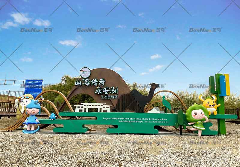 形象標(biāo)識:整個(gè)入口形象運(yùn)用綠色和褐色為主要顏色,體現(xiàn)景區(qū)的自然生態(tài)特色,利用山體的弧線作為主要邊界背景,使入口形象同時(shí)具備大氣和靈動(dòng)的特點(diǎn),搭配各元素之間的鏤空裝飾,使其與環(huán)境相得益彰。