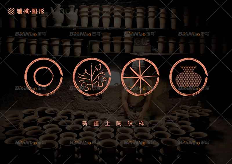 整個設(shè)計以土陶器的外形為主體,同時以具有旋轉(zhuǎn)態(tài)勢的幾何圖形,圓寓意土陶燒制技藝中的拉胚過程,配合陶土的紋理進行呈現(xiàn),并在LOGO中融入唐王城遺址和屯墾軍民的剪影。著力表現(xiàn)品牌其獨特的文化屬性,主題鮮明,寓意深刻,賦予了品牌識別性,凸顯圖木舒克土陶技藝的獨特地域特征。