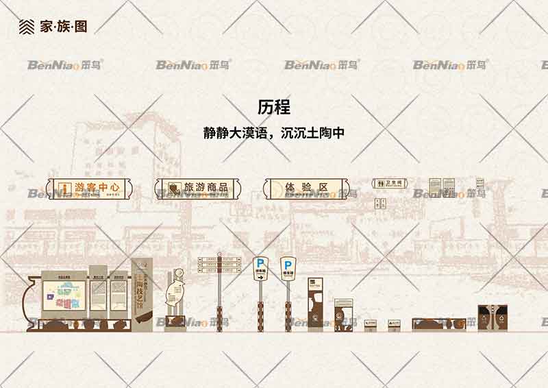 結(jié)合LOGO形象所傳遞出的視覺與文化內(nèi)涵,加之與環(huán)境的融合考量因素下,導視系統(tǒng)的視覺形式便已有了雛形,新疆圖木舒克市土陶館導視標識設(shè)計便在這樣的背景下誕生了。