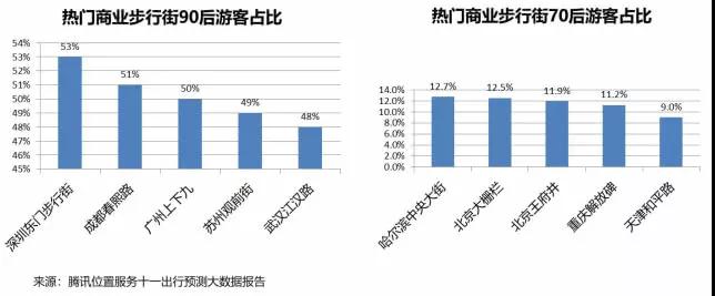 在逛街購物方面,90后和80后依然占據(jù)了超過三分之二。從不同年齡段的偏好來看,深圳東門步行街、成都春熙路、廣州上下九、蘇州觀前街和武漢江漢路是90后最愛逛的步行街,無一在北方;70后最愛逛的分別是哈爾濱中央大街、北京大柵欄、北京王府井、天津和平路和重慶解放碑,僅有一個在南方;80后則“兼容并包”,既有哈爾濱中央大街、北京大柵欄、北京王府井等位于北方城市的步行街,也有廈門中山路、重慶解放碑等南方步行街。