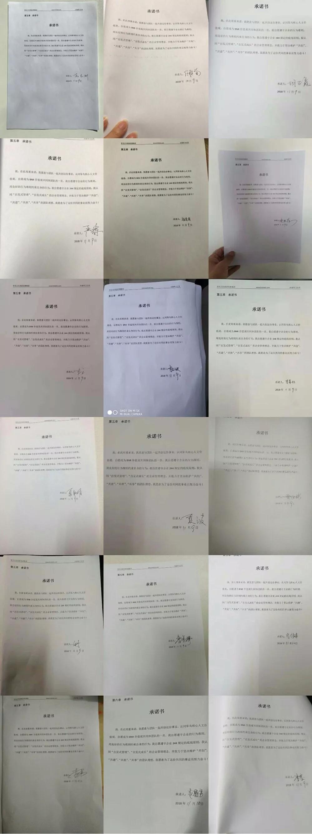 重慶總部辦公室、北京團隊、公司廠部所有員工都自愿簽訂承諾書,愿意與團隊一起共創(chuàng)這份事業(yè),認(rèn)同笨鳥核心人文價值觀,自愿成為BNR價值觀共同體團隊的一員。自愿遵守企業(yè)的行為準(zhǔn)則,用良好的行為準(zhǔn)則約束自身的行為;自愿遵守企業(yè)344規(guī)定的底線原則;我認(rèn)同“自發(fā)式管理”、“自發(fā)式成長”的企業(yè)管理理念,并致力于堅決維護“共創(chuàng)”、“共建”、“共擔(dān)”、“共享”的團隊理想。為了這份共同的事業(yè)而努力奮斗!