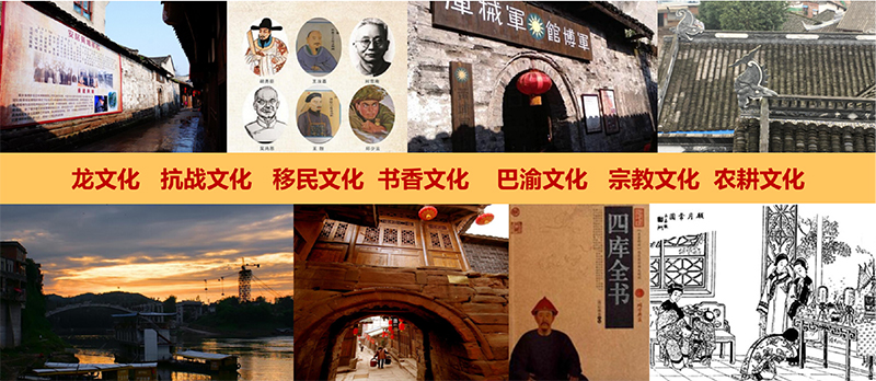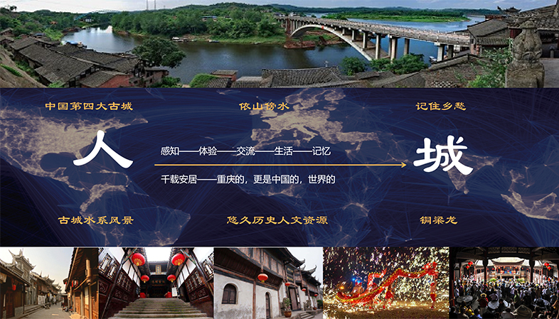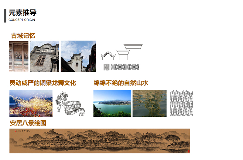 我們以安居古城千年文化積淀和歷史傳承最具代表性的承載物為主要文化展示意向,九宮十八廟、科甲坊、曾氏宗祠、瓊江書院、銅梁龍燈展廳等,將廟宇文化、才子文化、龍文化、市井文化和抗戰(zhàn)文化進行有機融合。